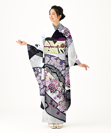 流れるように染分けし疋田柄と色を使い分けた古典柄の振袖。無地場を生かすため柄は少な目にデザインされておりシンプルに着こなしたい方におすすめの1着。