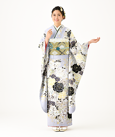グレーの地色に黒が印象的な板場友禅の振袖。バラが咲き誇り蝶が舞う華やかなデザインにあえて色数を抑えた配色で落ち着いた雰囲気のあるデザインです。メインのバラには横降り刺繡を入れ立体感を出しました。