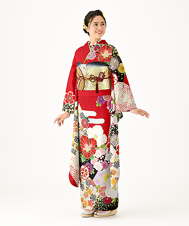 古事記や日本書紀にも登場し古来より縁起の良い花として使われている椿の花をデザイン化しメインの柄として使用しました。深い赤地にポップな色合いが可愛らしく華やかな振袖です。