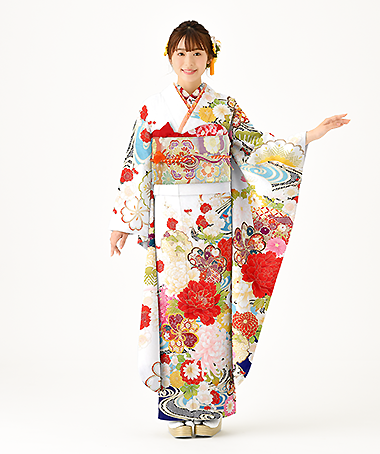 苦難や厄災を流し去ってくれるうえ、火から身を守るという願いが込めれれている流水文様に牡丹や菊の花が咲き誇る振袖。ねじり梅の中には吉祥文様を入れ晴れの日にピッタリな1着です。