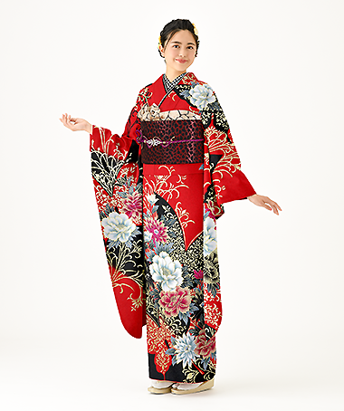健やかな成長への願いが込められた蝶のモチーフを大きく柄にし、花びらが多く目を引く牡丹の柄を合わせたモダンなデザイン。金彩加工をふんだんに入れる事で華やかさを出しました。