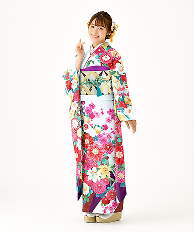 日本で古くから愛される菊の花をメインに牡丹や梅・桜の花を散りばめた華やかなデザインです。様々な色を掛け合わせぼかし技法を施し、金彩加工や横降り刺繡を施しました。